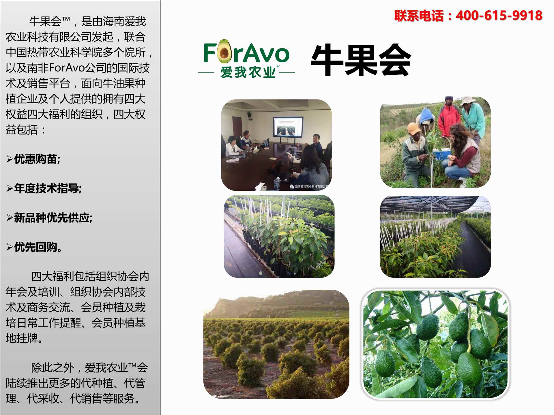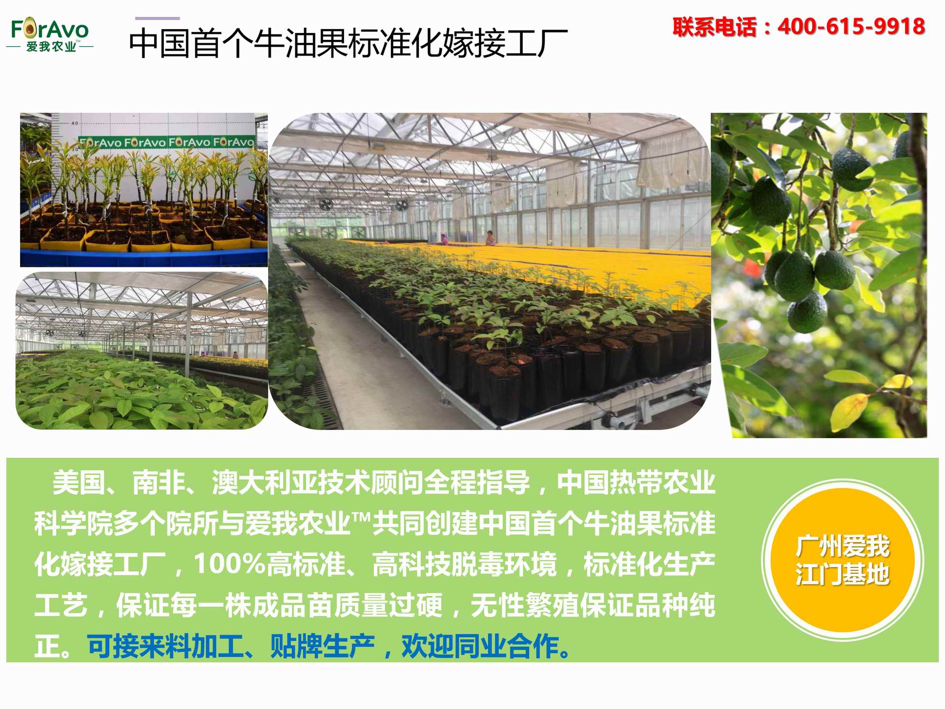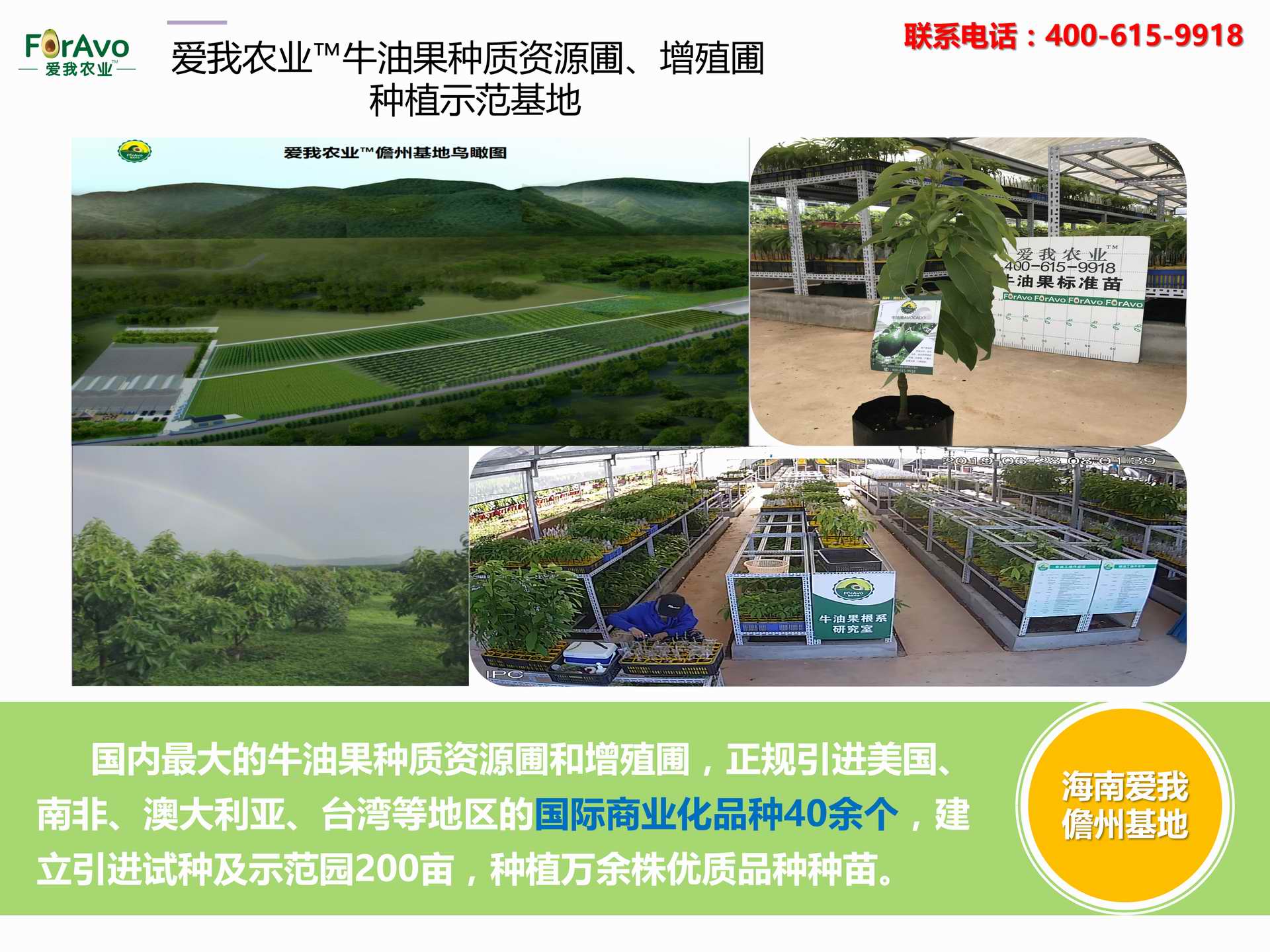 海南愛我農(nóng)業(yè)科技有限公司是一家綜合性的高科技農(nóng)業(yè)發(fā)展企業(yè),旗下愛我農(nóng)業(yè)TM致力于打造中國(guó)最大最強(qiáng)的牛油果種植企業(yè)。依托美國(guó)、南非、澳大利亞等擁有百年牛油果繁育、種植歷史以及產(chǎn)業(yè)鏈?zhǔn)袌?chǎng)的優(yōu)勢(shì),開展牛油果種苗繁育、種植技術(shù),種植加盟、深加工等產(chǎn)業(yè)。結(jié)合中國(guó)市場(chǎng),面向廣大苗圃基地、種植農(nóng)場(chǎng)、合作加工等企業(yè),推出的適合規(guī)?;?、標(biāo)準(zhǔn)化的牛油果全產(chǎn)業(yè)鏈服務(wù)。 Hainan Foravo Agricultural Technology Co., Ltd. is a comprehensive high-tech agricultural development enterprise , dedicated to building the largest and most powerful avocado plantation enterprise in China. Relying on the advantage of avocado nursery, planting history, and the industrial chain over 100 years in the United States, South Africa, Australia, we are carrying out nursery, planting, proce...